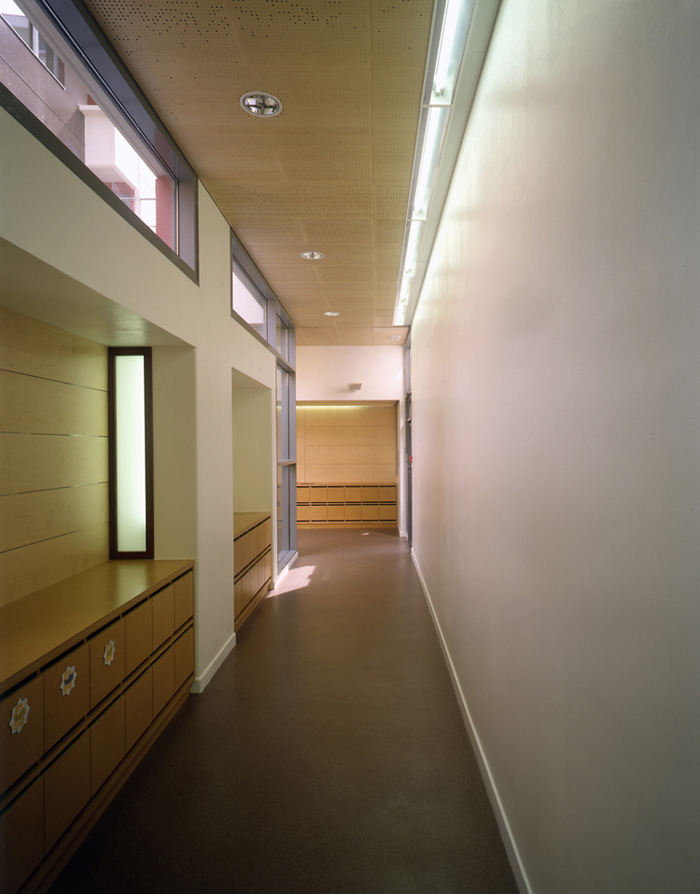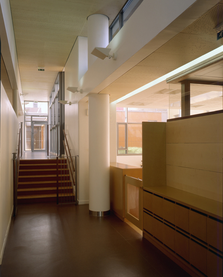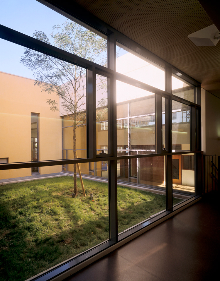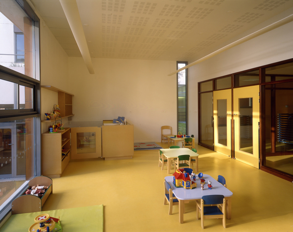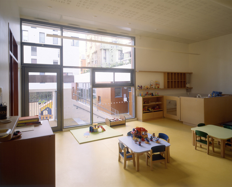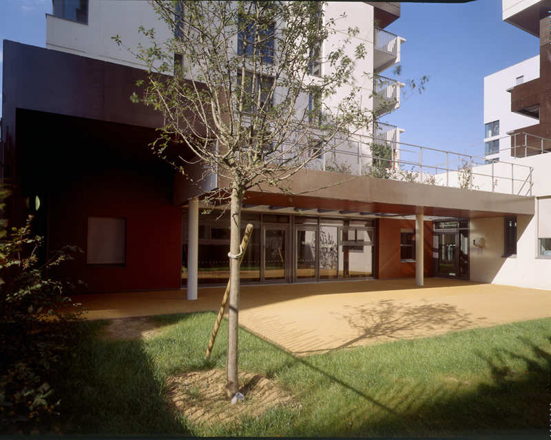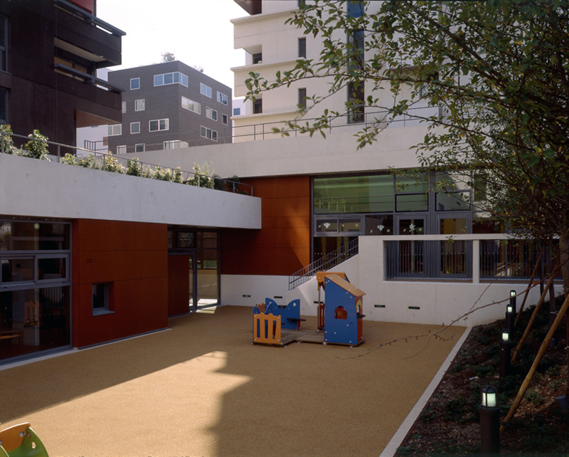 Livraison: Octobre 2008 Maître d’Ouvrage: OPAC de Paris et DFPE Aménageur: SEMAPA Architecte Mandataire: Philtre / H. Dubois, C. Massin BET tce: SIBAT Coût travaux: 8,9 M€ht SHON crèche / logements: 880 m2 / 5185 m2 L’opération se situe dans le quartier en cours d’achèvement de Paris Rive Gauche: ZAC Masséna Une règle urbaine forte, basée sur le principe de l’îlot ouvert,coordonne selon la charte établie par C. de Portzamparc ce « village « moderne à l’identité affirmée. La disposition des logements permet une pénétration maximale de la lumière dans les espaces internes et externes de la crèche L’ensemble des logements est concentré dans deux bâtiments-blocs organisés en quinconce. Distants de plus de 8 m des jardins , ils permettent à ceux-ci d’être pleinement accessibles aux enfants tout en assurant leur ensoleillement généreuxl aux heures d’ouverture de la crèche Un fond de parc frontal et perméable Le premier plot de logement, haut de 12 niveaux associés en rez -de-chaussée au traitement horizontal de la façade du jardin de la crèche est implanté en premier plan, Situé en retrait, le second bâtiment apparaît cadré par le premier et constitue un plan de fond, amplifiant l’espace libre du jardin des Grands Moulins (Ah Ah paysagiste). La limite modulée du tissu urbain sur le jardin crée des perméabilités visuelles à travers l’îlot La crèche. Elle occupe le rez de chaussée étagé en demi-niveaux et se développe, entre deux jardins occupant les angles libérés de l’îlot. Un hall longitudinal laisse percevoir toute la profondeur du terrain jusqu’au jardin sud, il est éclairé directement par un patio inaccessible, foyer lumineux de la crèche.que prolonge l’atrium, assurant la relation visuelle entre les deux jardins. Les blocs de logements. Le traitement contrasté des deux bâtiments traités sur le mode du positif - négatif renforce le rapport dialectique entre les deux blocs tout en conservant la lecture de la figure commune qui les lie.et qui marque l’intériorité de l’ilôt. Les trois derniers niveaux marquent l’émergence du bâtiment par rapport au skyline du quartier. Les terrasses y sont intériorisées ou totalement protégées (patio) et offrent des cadrages vers le ciel.