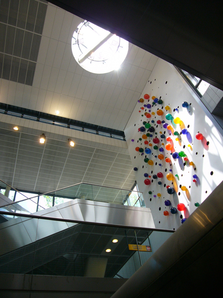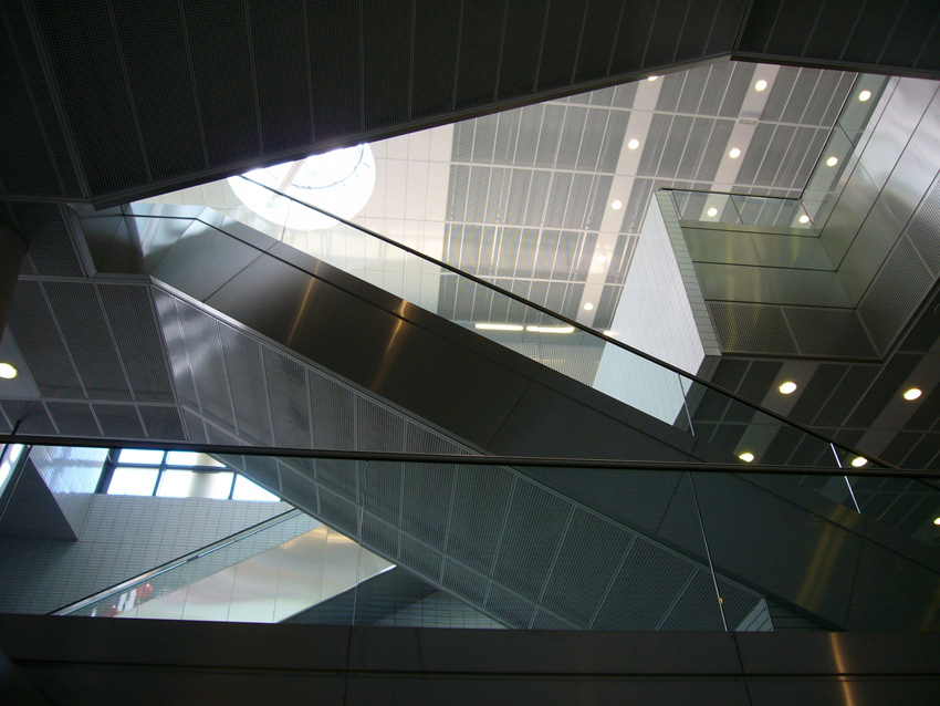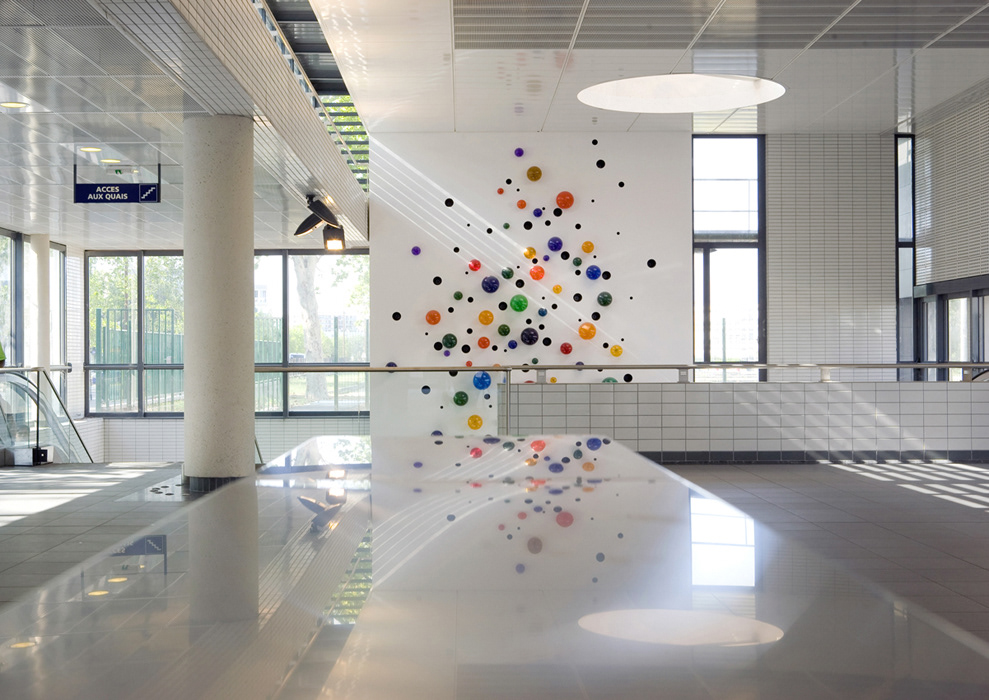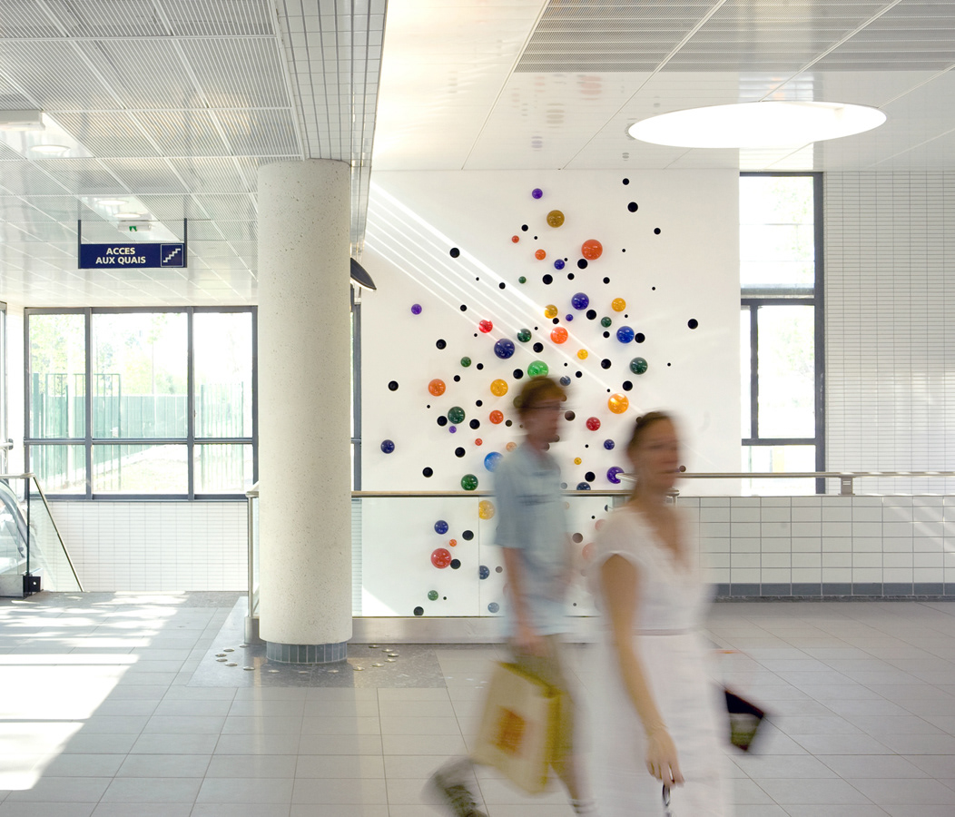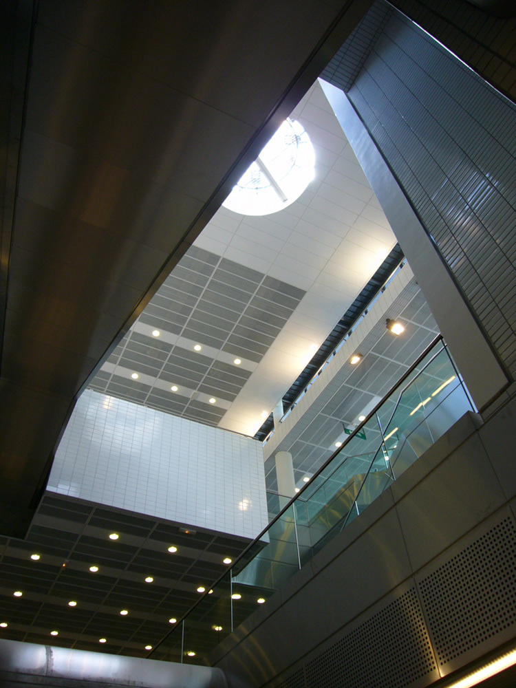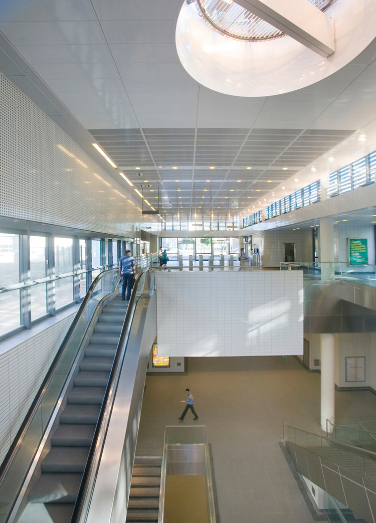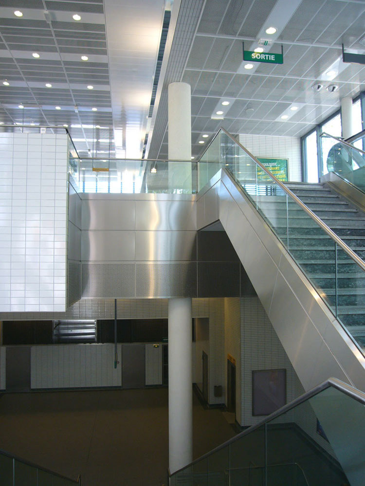 Livraison: Septembre 2007 Maître d’Ouvrage: SMTC MO délégué: SMAT BET (mandataire): SYSTRA Architecte: Philtre / Christophe Massin Intervention artistique: Didier Mencoboni Coût travaux (station): 5,8 M€ht SHON: 1460 m2 La station PHARMACIE s’inscrit dans l’opération de création de la ligne B du Métro de Toulouse à proximité de l’université de pharmacie (campus de Rangueil) Un auvent bas répond à l’orientation du Campus en s’inscrivant frontalement vis à vis du parvis futur, alors que le corps émergent de la station souligne et révèle la direction des voies métro ainsi que celle du chemin des maraîchers. Le parvis alternera traitement minéral et plantations La station se propose comme POINT FOCAL à l’étendue du Campus par le jeu des géométries convergentes. Ce mouvement horizontal vers la station se transmue en un mouvement vertical sol/quai auquel nous avons donné toute son ampleur. Le jeu des trémies propose une relation verticale forte dans les vues et parcours entre les niveaux sol, mezzanine et quai. Le vide sur mezzanine amplifié par les trémies des escalators en liaison directe avec les quais devient dès lors le lieu majeur du projet. L’asymétrie de la station (dans son traitement en coupe ainsi que dans la répartition et le jeu de la lumière naturelle) oriente les parcours et rompt la monotonie d’un aller offrant la même expérience spatiale au voyageur qu’un retour. Le passage par la mezzanine devient l’objet d’une «promenade» ou prendra place une intervention artistique (Didier Mencoboni), alors que les liaisons directes quai/salle des billets restent d’ordre fonctionnel. Cette spatialité verticale se poursuit vers les quais au moyen de l’élargissement et la superposition des trémies des escaliers fixes vers les quais. Offrant des échappées visuelles directes vers le niveau salle des billets, et même le ciel par l’intermédiaire d’ un vaste lanterneau venant coiffer l’ensemble du dispositif et assurant une lumière généreuse.